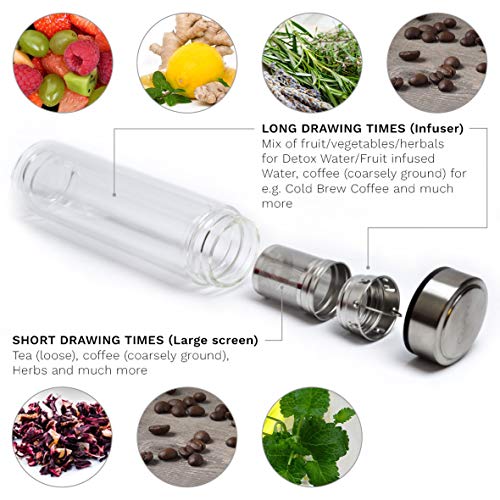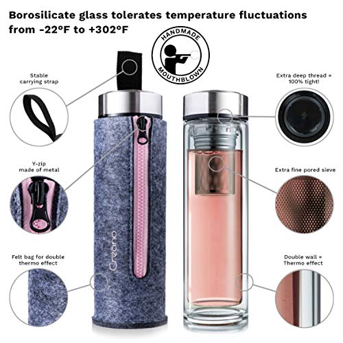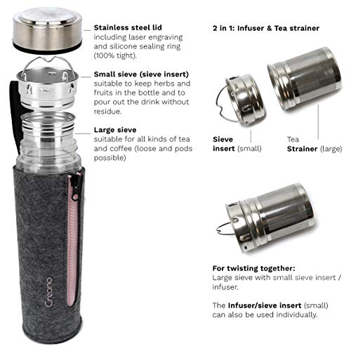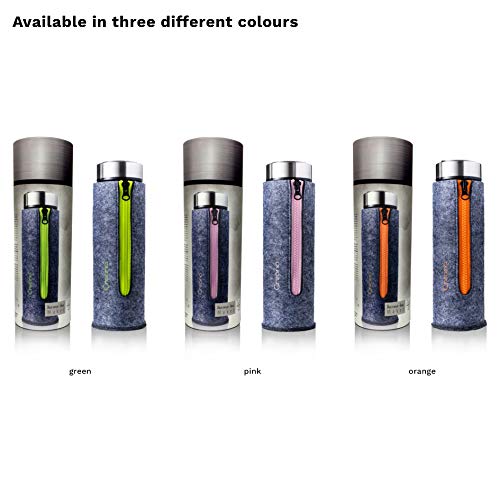 FUNCTIES: De stijlvolle vilten tas is een absolute eyecatcher en heeft de potentie om de nieuwe ster te worden op kantoor, in de sportschool enz. Naast de aangename haptische eigenschappen biedt het een effectieve isolatie van uw warme & koude dranken! 100% dicht & lekvrij, het glaslichaam en de zeef zijn vaatwasmachinebestendig. Het deksel kan met de hand worden gereinigd met warm water, afwasmiddel en een spons.