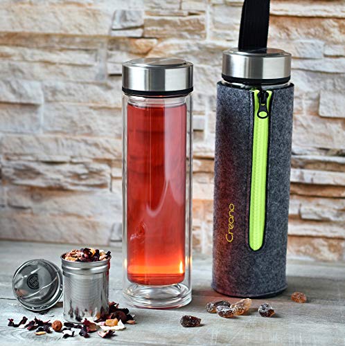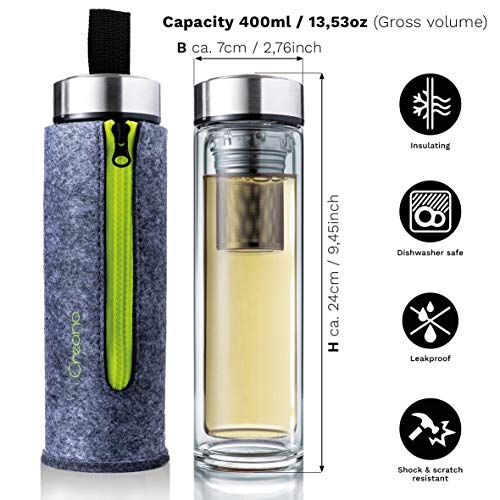 Creano exclusief theemaker “Thermo-Teamaker” 400ml gemaakt van dubbelwandig borosilicaatglas met afneembare roestvrijstalen theezeef & deksel in een edel vilten zakje in een hoogwaardige geschenkdoos (groen)