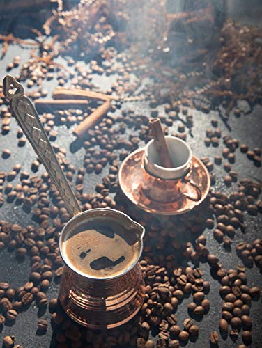 Turkse koffiepot voor 3-4 portie, Turkse koperen koffiekan, gegarandeerd de juiste kan voor de perfecte Turkse koffie of mokka. De bereiding van Turkse koffie: ingrediënten voor Turkse koffie, 3-4 TL fijn koffiepoeder (het beste vers gemalen ), 2 TL suiker 3-4 Turkse koffiekopje water Turks koffiepot/mokkakan, specerijen Zo bereidt je Turkse koffie tot eerste het water in de mokkakan en verwarmt het. De suiker voegt haar toe zodra de eerste luchtbellen zich laten zien. Als het water kookt, voeg je het vers gemalen koffiepoeder toe en roer het geleidelijk goed in, zodat het niet boven zweeft. De koffie laat je nu zo lang koken, tot er zich een schuimlaag vormt en de Turkse koffie bijna overkookt. Nu haal je het schuim eraf en doe je er een lepel van in elke mok. Zet de cezve terug op de warmtebron en herhaalt het proces een tweede keer. Tot slot kun je de Turkse koffie op de kopjes verdelen. In stijl geserveerd wordt Turkse koffie in klassieke mokka-kopjes of als alternatief in espressokopjes. Afhankelijk van de smaak kun je nog kardemom, kaneel, kruidnagel of rozenwater toevoegen. Vooral in de Arabische ruimte wordt de mokka vaak extra gekruid. Daarvoor dekt je Turkse gebak, baklava of zoete daddels op. Na een korte tijdje zet het koffiedik zich op de bodem van de kopjes. Dit behoort tot een klassiek mokka en aan het einde van de ceremonie kun je dan het koffiedik lezen. Geniet nu van je koffie met deze koperen koffiekan. Guten smakelijk