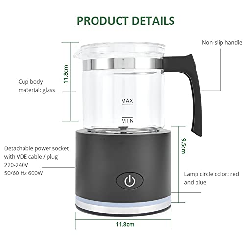 Functie:1. Eén knop om te openen, 2 soorten conventionele modi, kan melkpoeder, chocoladepoeder, hete melk, melkschuim op kamertemperatuur, verwarmingsschuim roeren.2. Magnetische levitatieschuim, een chocoladeroerder die de melk verwarmt tot ongeveer 65+/-5℃. Laat je gemakkelijk een mooie en heerlijke cappuccino/latte/macchiato/warme chocolademelk krijgen op een drukke ochtend.3. Aan de onderkant van de host is een microschakelaarcontact geïnstalleerd. Wanneer de melkbeker wordt opgetild of plat wordt gelegd, wordt deze automatisch uitgeschakeld om veilig gebruik te garanderen.4. De onafhankelijke powerbase en de onafhankelijke cup zijn geschikt voor de rechter- en linkerhand van de gebruiker. Het ontwerp van de antislipvoetzool zorgt ervoor dat het lichaam zonder trillingen op gladde oppervlakken van verschillende materialen kan werken.5. Elektrische melkopschuimer maakt gebruik van een stil ontwerp, geen storende slaap, geluid onder de 70 decibel brengt niet alleen verrukkingen, maar brengt ook rust.Hoe te om Gebruik:1. Giet de juiste hoeveelheid melk in om de maximale capaciteitslijn (Maximum) niet te overschrijden.2. Nadat u de voeding hebt aangesloten, klikt u op de schakelaar om te beginnen met werken.Specificatie:Artikeltype: MelkopschuimerMateriaal: ABS+GlasKleur: ZwartHoogte: Ca. 19,5 cm / 7,7 inchBreedte met handvat: ongeveer 15 cm / 5,9 inchCup-mondmaat: ongeveer 10 cm / 3,9 inchGewicht: ongeveer. 963g / 34ozNominale spanning: 220V/EUNominaal vermogen: 600WNominale frequentie: 50/60HZMaximale capaciteit: 250MLLichtinstructie Bediening:Klik: Rood indicatielampje, warme melkDubbelklik: Blauw indicatielampje, normale temperatuur Pakket Lijst:1 x melkopschuimerbasis1 x container 1 x beschermkap1 x handleiding < a>2 x Roerkop (een