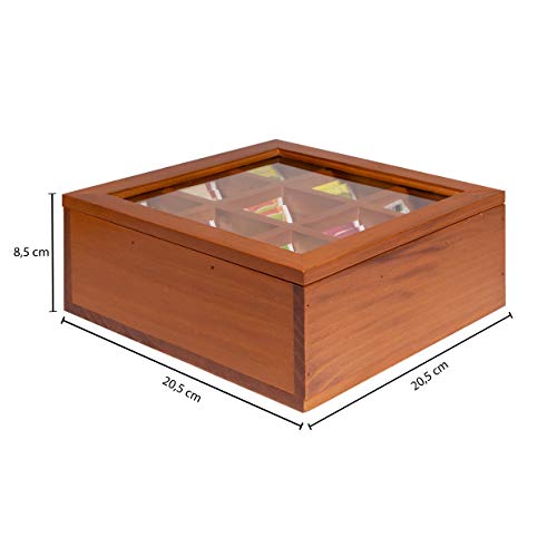 De theedoos is gemaakt van hout en glas, heeft een afmeting van 20,5 x 20,5 x 8,5 cm. Afmeting vakjes: 6 x 6 cm en 7 cm diep en de kleur is bruin.
