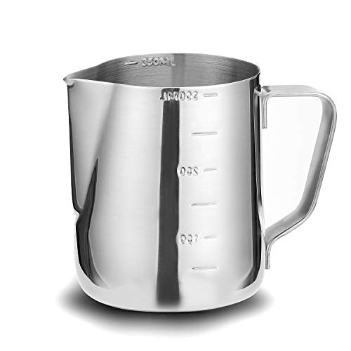 Premium roestvrij stalen opschuimkan: gemaakt van hoogwaardig 304 roestvrij staal met een capaciteit van 350 ml), het is geschikt voor levensmiddelen en zal niet roesten of vlekken – veel duurzamer en robuuster dan kunststof of glazen bekers.
